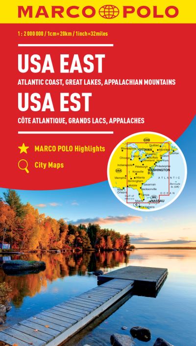 Marco Polo USA East Map: the ideal map for your trip Let the Marco Polo USA East Road Map guide you around this incredible country. Discover the Atlantic Coast from Boston to Miami, explore the Great Lakes and the Appalachian Mountains with this highly durable, overview map of USA East. It folds away easily and is always on standby to help when you’re stuck. Perfect touring map – the scale is 1 : 2 000 000* ideal to help you tour the main highways by car, RV or campervan Easy to use – the super clear mapping in strong colours and clear text will help you navigate the region Includes 11 city maps – detailed street maps of Atlanta, Boston, Chicago, Detroit, Fort Lauderdale, Miami, Miami Beach, New York, Philadelphia, Savannah and Washington DC as well as maps of key National Parks including the Everglades and the Great Smoky Mountains USA East highlights – major sights and key points of interest are marked on the map by numbered stars and these are listed in the index booklet with a brief description to help you pick the best places to see en route Extensive index – the thorough index is fully cross-referenced to the map to help you pinpoint your destination quickly For the big trips and the little detours, trust Marco Polo’s clear mapping and thorough index to guide you around beautiful USA East. *(1: 2 000 000 / 1cm=20km / 1inch=32 miles).